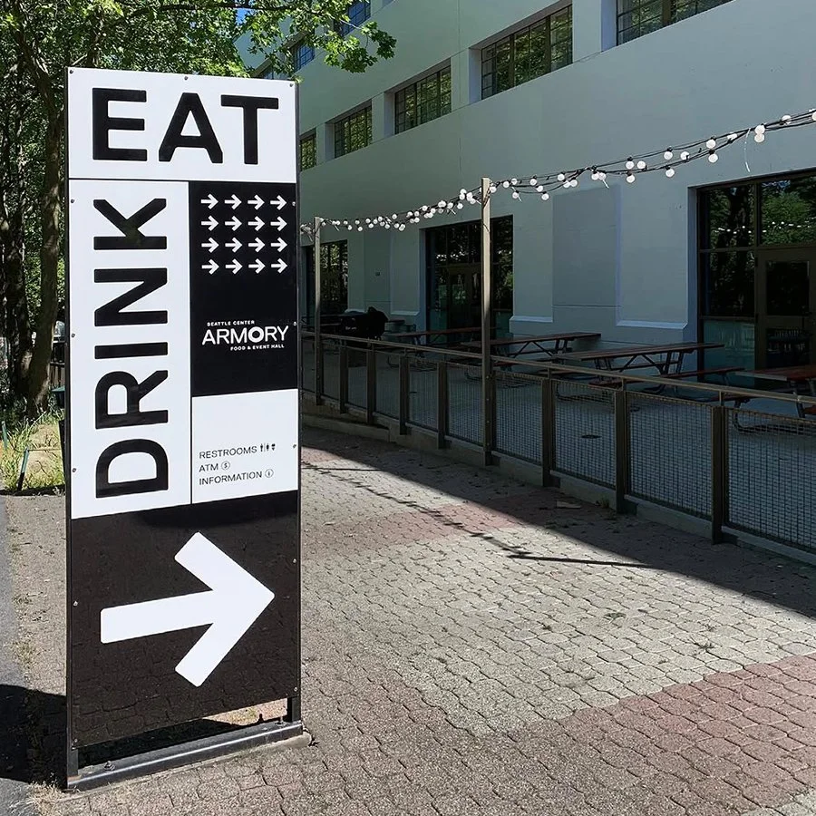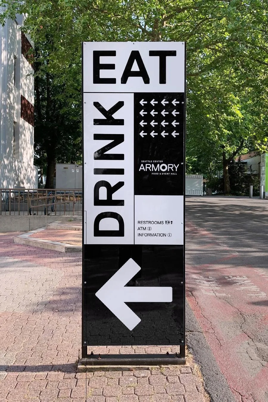 That same vision carried into the signage and wayfinding system, which I looked to the great food halls and markets found throughout the world to inform. The approach is intentionally restrained, allowing the energy of the vendors, events, and activity inside to project forward. The goal was a system that orients visitors clearly while stepping back to let the place speak for itself, restoring the Armory to its rightful place as the center of Seattle Center.