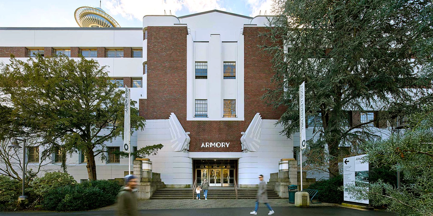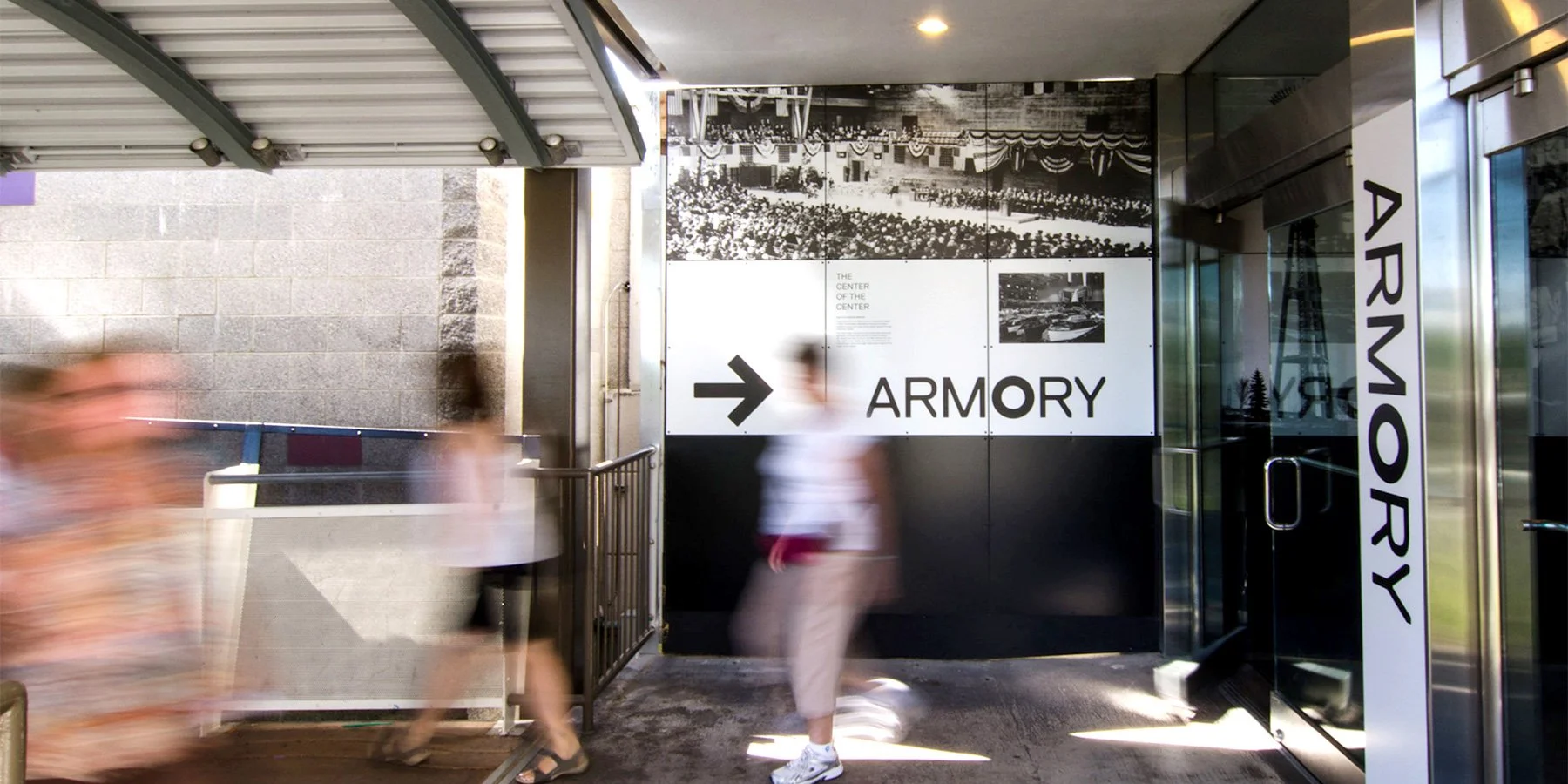 Since its construction in 1939 as a National Guard Armory, this Art Moderne civic landmark has served a remarkable range of purposes, most notably as an exhibit hall for the 1962 World's Fair. Over the decades, layers of outdated signage, oversized canopies, and tired graphics had obscured the building's original character. Phase 1, in collaboration with Graham Baba Architects, stripped it back and reinstated the Armory name. Phase 2, executed by BuildingWork, brought that renewed identity to the building's exterior, and that's where my work began.